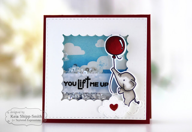 To create this card, I used the Stitched Square Stacklets and Inside Scallop Square Stacklets to die cut a focal point into a Sugar Cube cardstock panel. Using the Cloud Nine Background stamp and Distress Inks (Chipped Sapphire, Salty Ocean and Tumbled Glass), I heat embossed the stamped image and inked the cloud background. The cute little elephant is colored with Copic markers and placed on a puffy duo of clouds. A sentiment, heat embossed on vellum, and turned into a shaker complete this card.