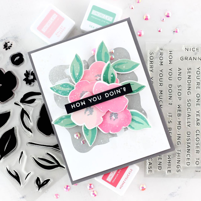 This stamp set is perfect for creating those dreamy, organic floral shapes. To create this card, I started by inking the stamps using various shades of pink from Concord & 9th. I layered this on top of a grey background using the images from the Abstract Nature stamp. A few white inky splatters and a sentiment from the Causal Tagline stamp set completes this card.